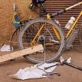 From Mâhamid, we cycled back to Tagounite and then aimed for a road of a type that on my map was not even mentioned in the legend. This looked promising! Since we didnât want to return all the way back to Zagora, we decided to stay on this side of the mountains and cycle along the desert instead. It turned out that these 200 kmâs were in a very bad state. Constant washboard roads with big rocks and sand not only made me fall of the bike twice but also gave me a wryneck, a stiff back and a sore ass. Hamzaâs bike suffered quite a lot from the three hard days that this road took us. He lost a rack screw, his front rack cracked and finally his whole kickstand welding came off from the frame. At one point, when we were cooking next to the road we prayed to Allah for a car to appear and after five minutes the only car that we saw that day appeared out of nowhere. So we hitchhiked to the small village ZaouĂŻa Sidi Abd en Nebi where we cooked some lentils and fell asleep.